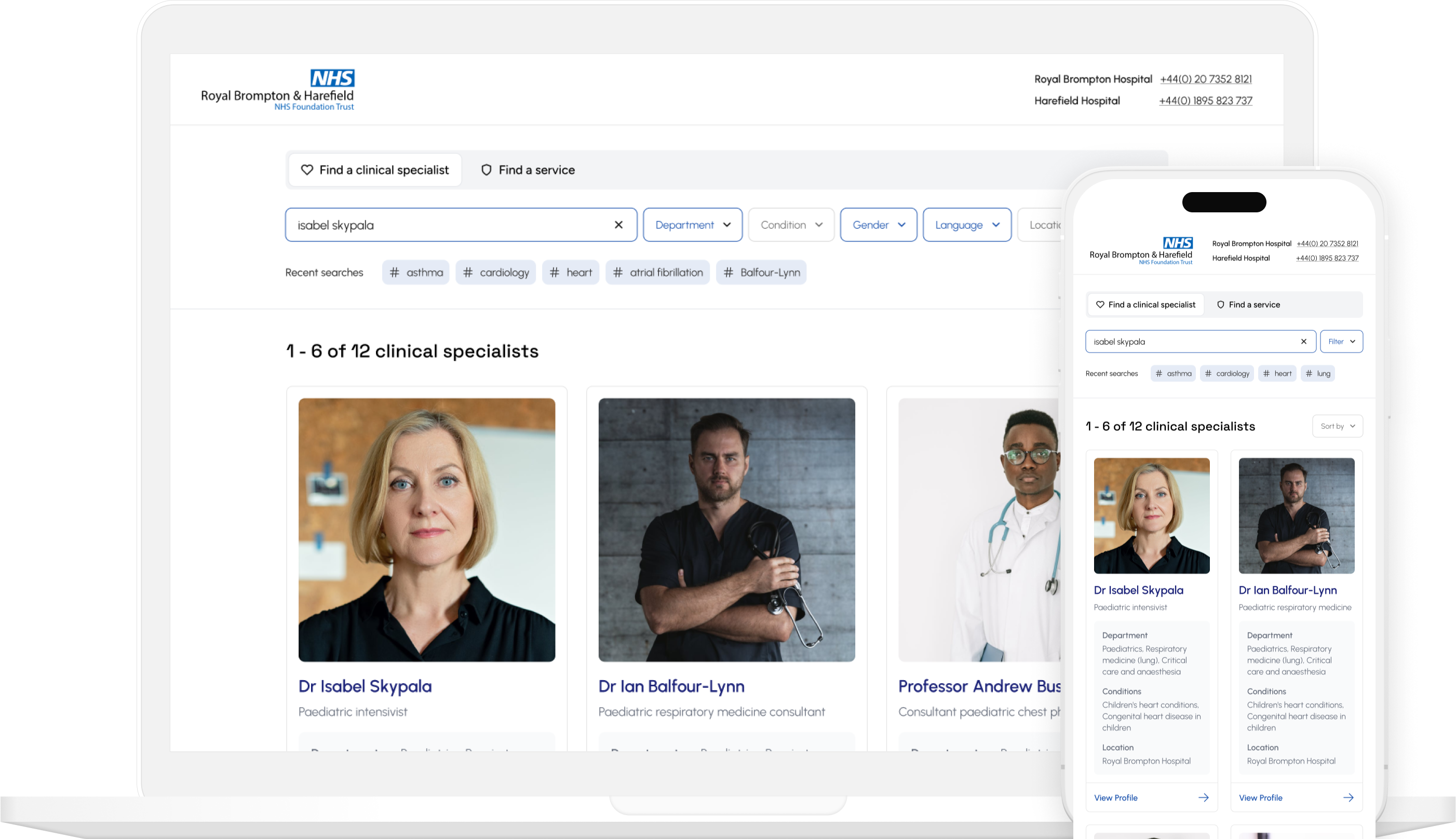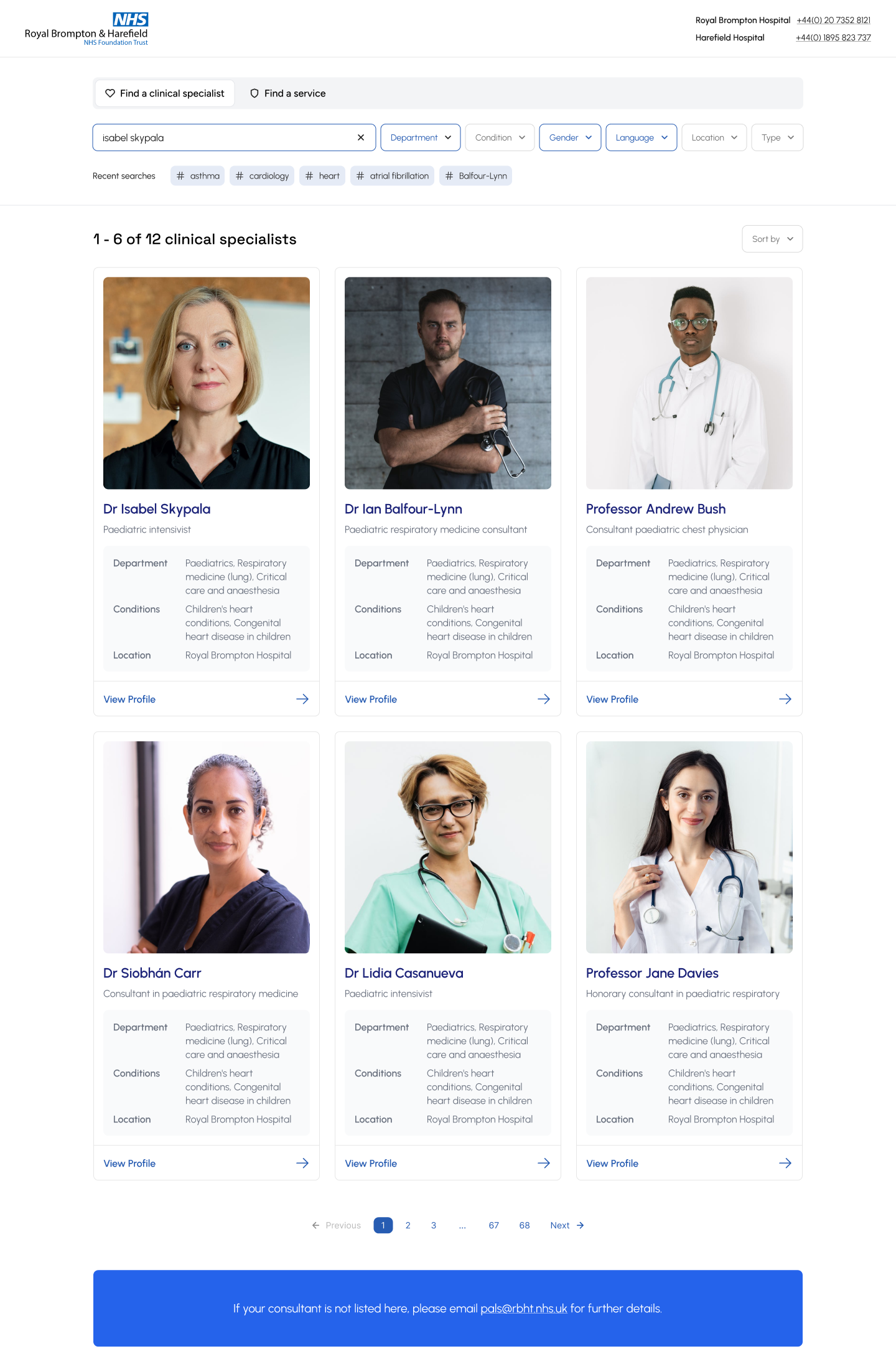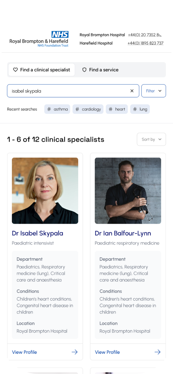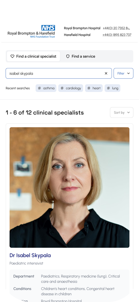 Search by consultant name, specialism, condition, symptoms or department. This gave users multiple ways of finding the right specialist.