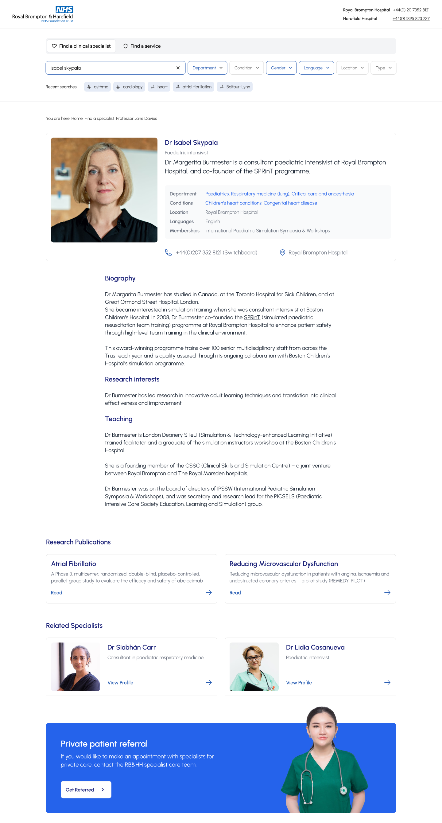 We ran several rounds of usability testing with high-fidelity wireframes, both remote and in person. Patient feedback showed that the search needed clearer entry points and more intuitive filters to narrow results, while staff highlighted the value of related information appearing alongside consultant profiles.